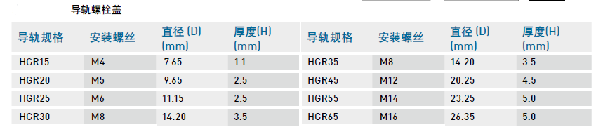 為防止切削粉末或異物經由螺栓孔侵入滑塊內部影響精度,客戶必須在安裝導軌時將螺栓蓋打入螺栓孔內,每支導軌出廠時皆配有螺栓蓋。