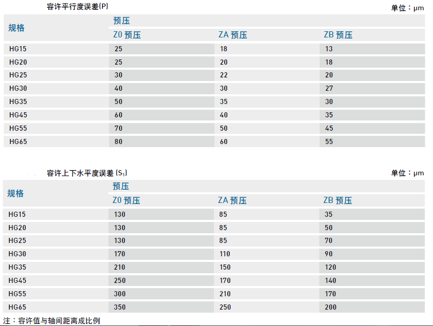 HG系列為圓弧兩點接觸式直線導軌,其自動調心的特性可以吸收安裝面的些許誤差而不影響直線運動的順暢性;下表中注明了安裝平面的容許誤差值: