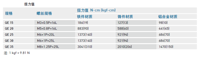 導(dǎo)軌裝配螺絲之扭力值安裝導(dǎo)軌時(shí)是否鎖緊貼平基準(zhǔn)面影響直線導(dǎo)軌精度甚劇,因此為達(dá)到每顆螺絲都能鎖緊的目的,建議使用下列扭力值鎖裝配螺絲。