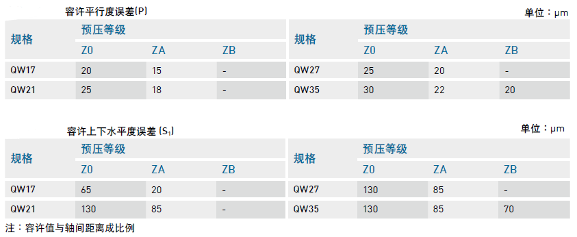 2、安裝平面誤差,直線導軌QW系列為圓弧兩點接觸式直線導軌,其自動調心的特性可以吸收安裝面的些許誤差而不影響直線運動的順暢性;下表中注明了安裝平面的容許誤差值: